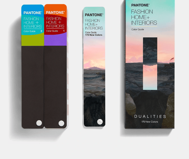 Hướng dẫn màu FHI + Gói mở rộng Dualities được đựng trong bao bì sản phẩm sưu tầm và cung cấp cho bạn ba hướng dẫn cầm tay với công thức phủ thân thiện với môi trường của Màu giấy dệt – Xanh lá cây (TPG) phù hợp với Hệ thống bông dệt - chất liệu vải (TCX) , cho phép thiết kế linh hoạt hoàn toàn. Đây là công cụ hoàn hảo khi di chuyển để truyền cảm hứng và giao tiếp màu sắc cho gốm sứ, sơn, mỹ phẩm, phụ kiện thời trang và đồ da.